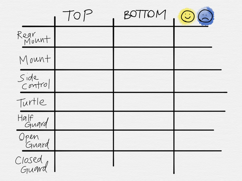 Before jumping into flow charting, I recommend writing down your favorite moves from each major position. This is most useful for beginners to see where they are lacking knowledge. When I get white belts to do this exercise for the first time, it is often a mind blowing experience.